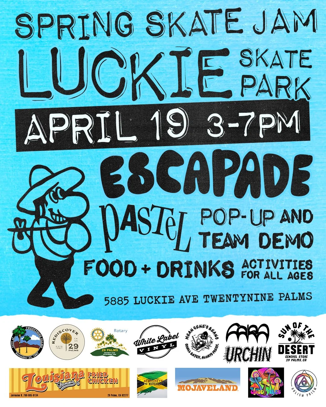 Skate Jam is coming to Luckie Park Skate Park on Saturday, April 19 from 3-7 PM for an afternoon of skating, community, and fun in Twentynine Palms.